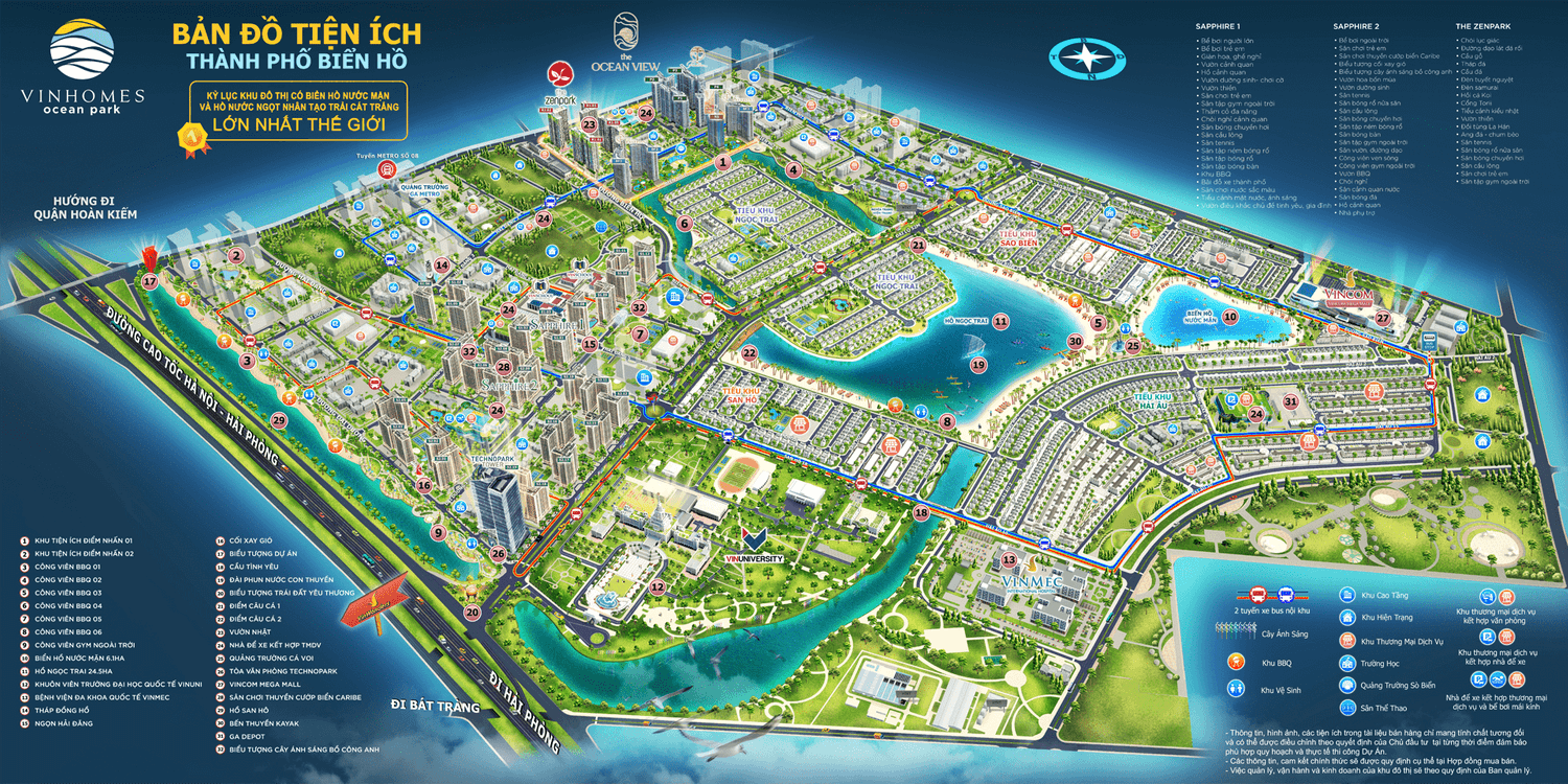 Tại Vinhomes Ocean Park, chúng tôi kiến tạo một thành phố với điểm nhấn là biển hồ nước mặn 6,1 ha cùng với hồ trải cát trắng 24,5ha mang lại cuộc sống biển xanh, cát trắng mỗi ngày cho cư dân. Mang tầm vóc của Đại đô thị ALL – IN – ONE, Vinhomes Ocean Park còn nổi bật bởi Trung tâm thương mại Vincom lớn nhất Việt Nam, tòa nhà công nghệ Technopark cùng hệ thống đại tiện ích như GYM park, BBQ park cùng hàng trăm sân thể thao đa dạng hài hòa giữa không gian sinh thái cây xanh, mặt nước.